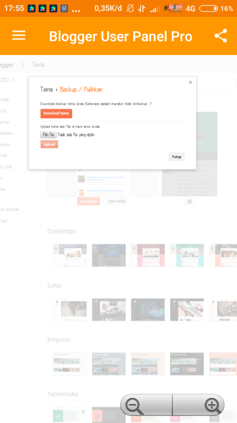 -Setelah template yang sobat edit tadi sudah disimpan, sekarang masuk ke Tema Blogger dan pilih Backup/Pulihkan. Lalu sobat tingggal Pilih File yang sudah sobat edit tadi. Lalu pilih Upload.