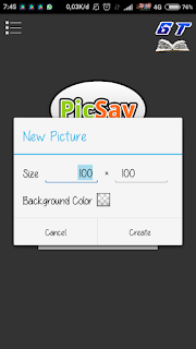 Kalau sobat belum punya aplikasi ini, sobat bisa download di PlayStore atau Google. Setelah masuk aplikasi PicSay Pro, silahkan tekan "Get Picture". Lalu tekan new picture dan buat sizenya 100×100. Usahakan backgroundnya transparan ya sobat.