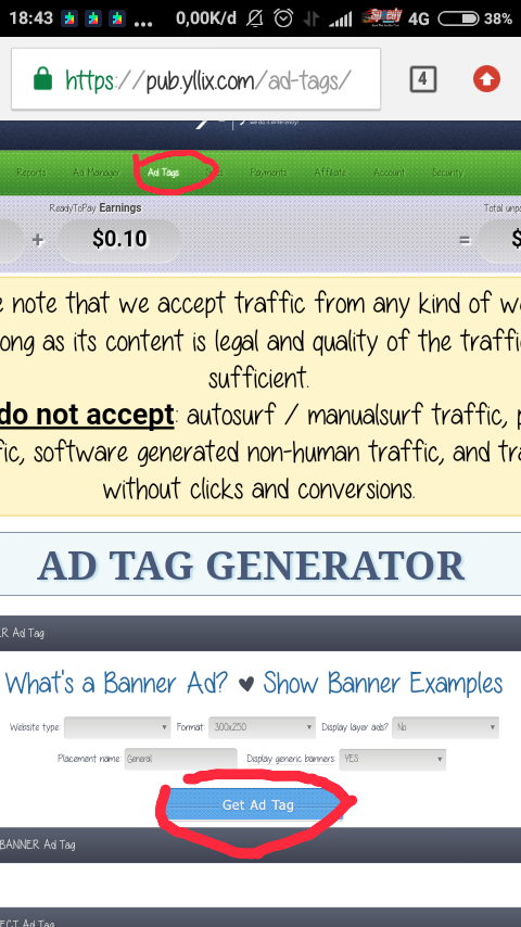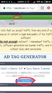 Sobat ambil kode iklan dengan masuk ke Ad Tags. Sobat pilih website type Mainstream saja. Sobat juga pilih berapa ukuran bannernya. Setelah itu sobat pilih ya pada display ad, karena uang yang dihasilkan lebih banyak. Lalu sobat klik Get Ad Tag untuk mendapat kode iklan tersebut.