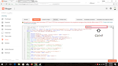 Dalam langkah ini, sobat harus mengedit kode html. Untuk mempermudah dalam mencari, sobat bisa gunakan Ctrl+F. Untuk lebih jelasnya lihat gambar.