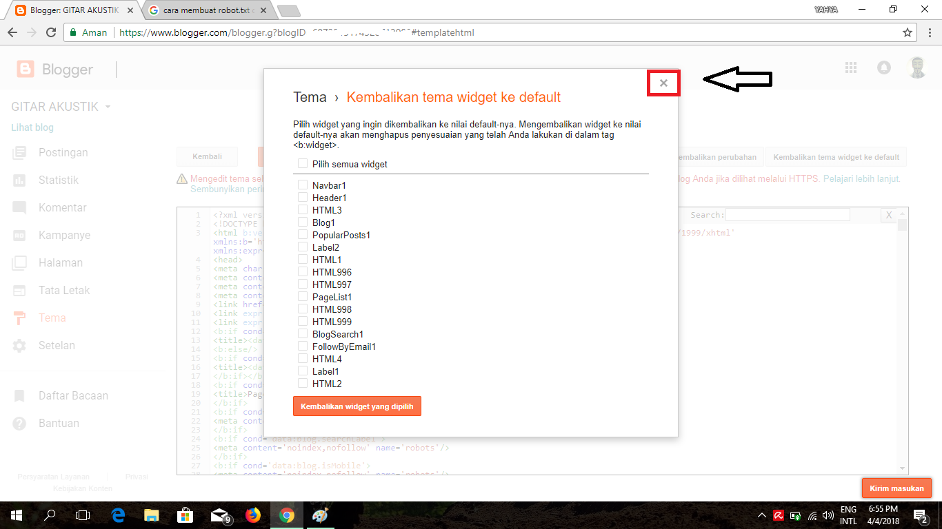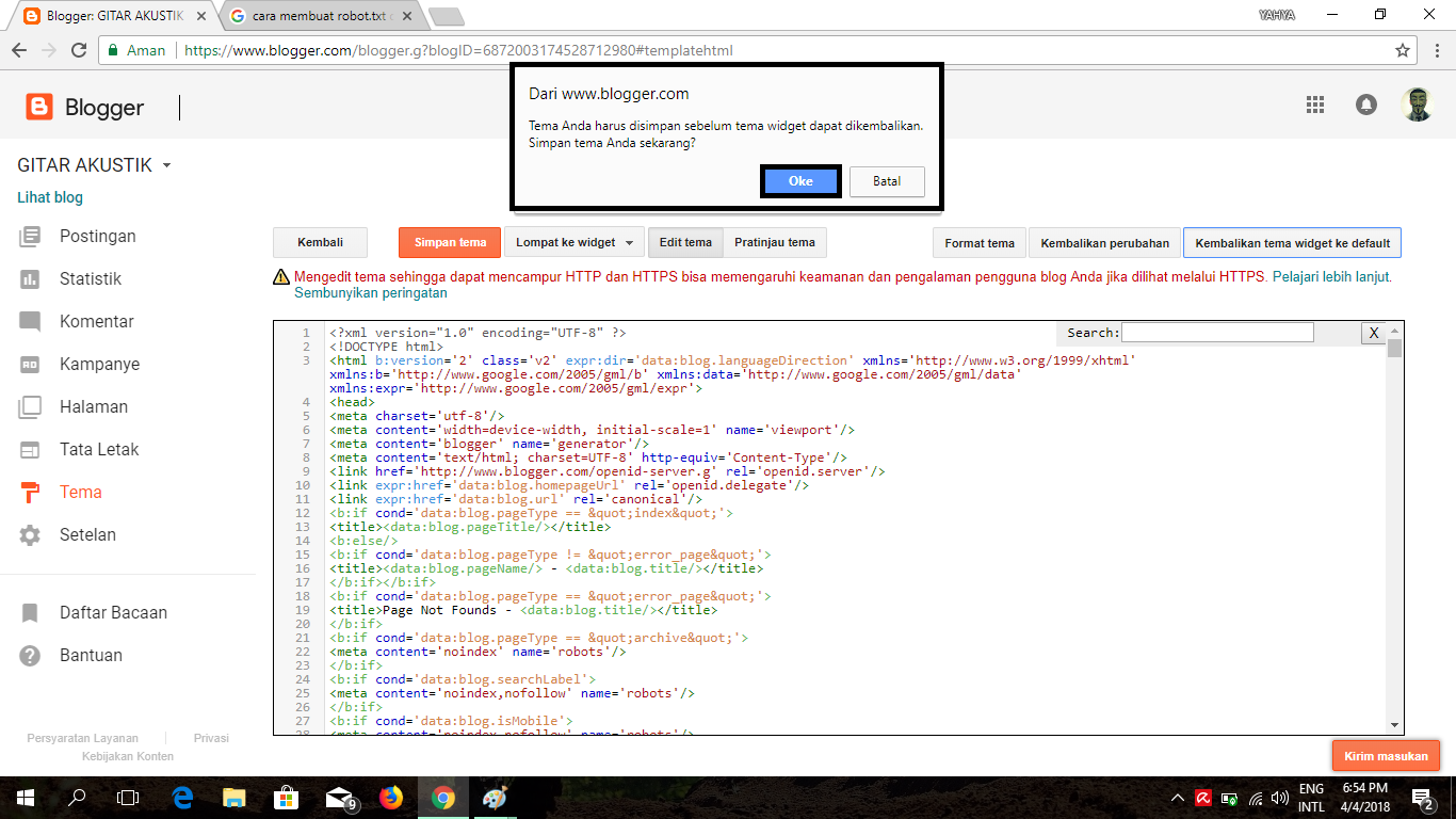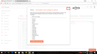 Untuk menyimpan, sobat jangan pilih Simpan Tema, tatapi sobat tekan "Kembalikan tema ke widget default". Sobat jangan khawatir, karena tema sobat tidak akan hilang. Kalau ada peringatan/pesan dari Google, sobat pilih saja "Oke". Kemudian jika sudah selesai, sobat close saja pada kembalika tema ke widget default.