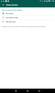 Kemudian, Anda bisa menentukan siapa saja yang bisa melihat status Anda. Apakah seluruh kontak, pengecualian untuk kontak-kontak tertentu, atau hanyalah beberapa kontak pilihan?